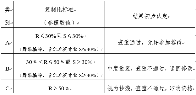 A类别:正式检测报告中,去除本人复制比≤30%的毕业论文(设计)且校内互检≤30%(有另行规定的专业按另行规定标准执行,下同),视为通过检测,允许参加答辩。
